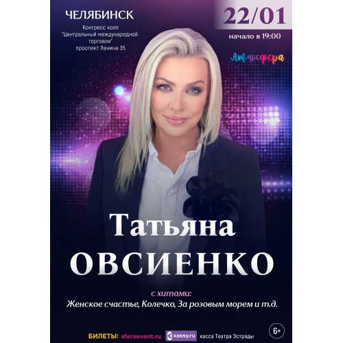 Татьяна Овсиенко — популярная эстрадная певица, заслуженная артистка России, обладательница премии Золотой Граммофон, постоянная участница фестивалей Песня года, Легенды Ретро ФМ. Дебют Татьяны состоялся в легендарной группе Мираж в конце 80-х годов. С 1991 года начала сольную карьеру, став одной из самых известных и любимых певиц Росси и всего СНГ. Ее хиты «Капитан», «Женское счастье», «Колечко», «Дальнобойщик», «За розовым морем» и многие другие вошли в золотой фонд российской популярной музыки. Каждое концертное выступление Татьяны Овсиенко неизменно дарит публике заряд положительных эмоций и встречу с любимыми песнями.